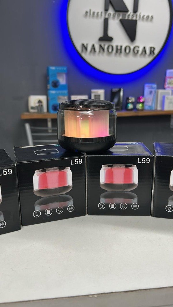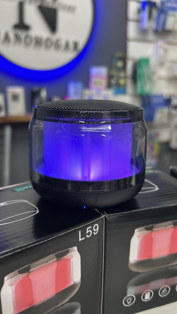 El Mini Parlante L59 es un altavoz portátil y recargable con conectividad Bluetooth, luces LED, y función manos libres para llamadas. Ofrece sonido estéreo de alta definición, tiene entradas para Micro SD y cable auxiliar, e incluye un micrófono integrado para llamadas más claras. Su diseño compacto y ligero facilita su transporte para escuchar música en cualquier lugar.