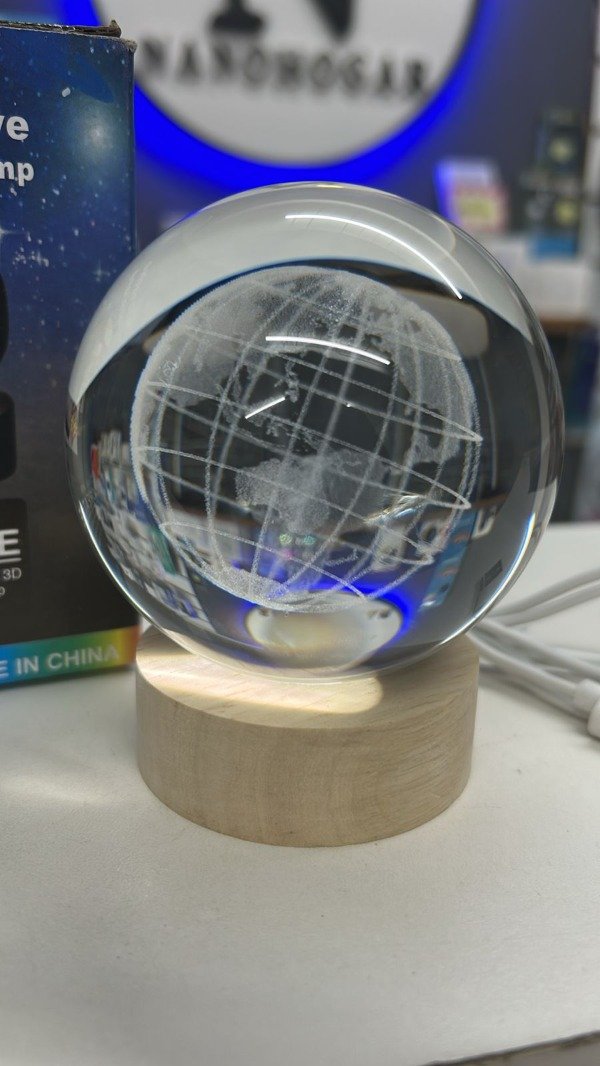 objeto ornamental que consta de una esfera de cristal, a menudo con diseños grabados en su interior, y una base de madera que contiene luces LED. Su propósito es crear un ambiente acogedor con una luz suave y cálida, sirviendo como luz de noche o como un elemento decorativo en interiores. La iluminación es alimentada por USB, lo que permite conectarla a diversas fuentes de energía como computadoras, cargadores o bancos de energía.
